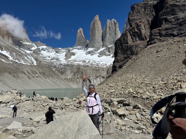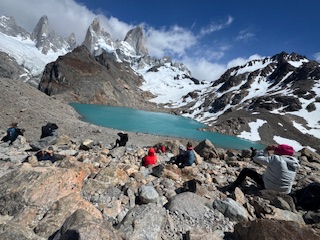 Woke up early for our hike to the Torres. It was a very tiring hike especially the last mile. It was scrambling through rocks and sometimes with water in them. Bharat Bhai and me were among the last. Bharat Bhai almost gave up but Pablo who was our second guide today with Renata convinced him to continue. The granite tres mountain on top wit the glacier under them was fabulous. We took lots of pictures…. And had lunch there. Too soon we started the descent. Was it hard? I slipped a couple of times and once tumbled twice. But we made it. We were so tired. We did some stretching after coming back and that helped a bit. Shower helped and after dinner we were dead tired. So lucky to have the dinner served to us while others were making their own pasta or soup meal in their small burners. I really enjoyed seeing the couples’ cutting veggies and doing their own thing in their corners. There were people from all over the globe. We slept good.
