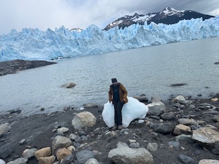 The ride took us very close to the glacier, and it was superb. There was this boat guy who was so happily taking pictures of people. We did not expect to see the glacier so close and enjoyed it fully. There were lots of icebergs floating around. In a way we were saying bye to the mountains, and it was bittersweet. We were dropped at a beach from which we walked to the shore. It was about half an hour’s walk and not too windy and cold. The driver was waiting for us at the end to take us back to Puerto Natales. On the way we made a few stops to the best views of the mountains and water.