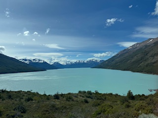 We reached El Calafate. Our hotel was like an Airbnb. There was no one to receive us but we entered with a code and it was warm and cozy place. We had purchased some food at the bus station which we ate in the bus but some was left which we stored in the fridge. The breakfast room overlooked two lakes and the mountains. It was a good view.